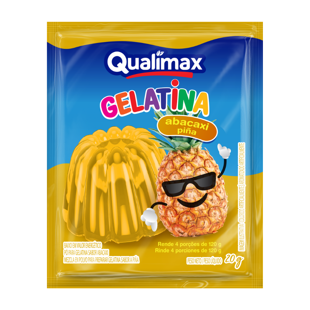 A linha de gelatinas Qualimax é prática, colorida e cheia de sabor. Disponível nos sabores abacaxi, uva, morango, cereja, framboesa e limão, é perfeita para sobremesas leves e refrescantes, com a qualidade que você confia para o dia a dia.