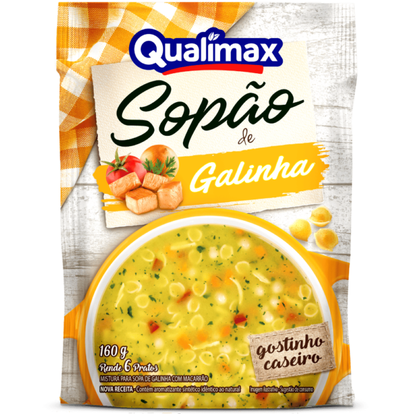 A linha de sopões instantâneos Qualimax é prática, saborosa e ideal para refeições rápidas e nutritivas. Disponível nos sabores carne, galinha, galinha caipira, mandioquinha, feijão com couve e canjão de galinha, é perfeita para aquecer o dia a dia com aquele gostinho caseiro que todo mundo gosta.